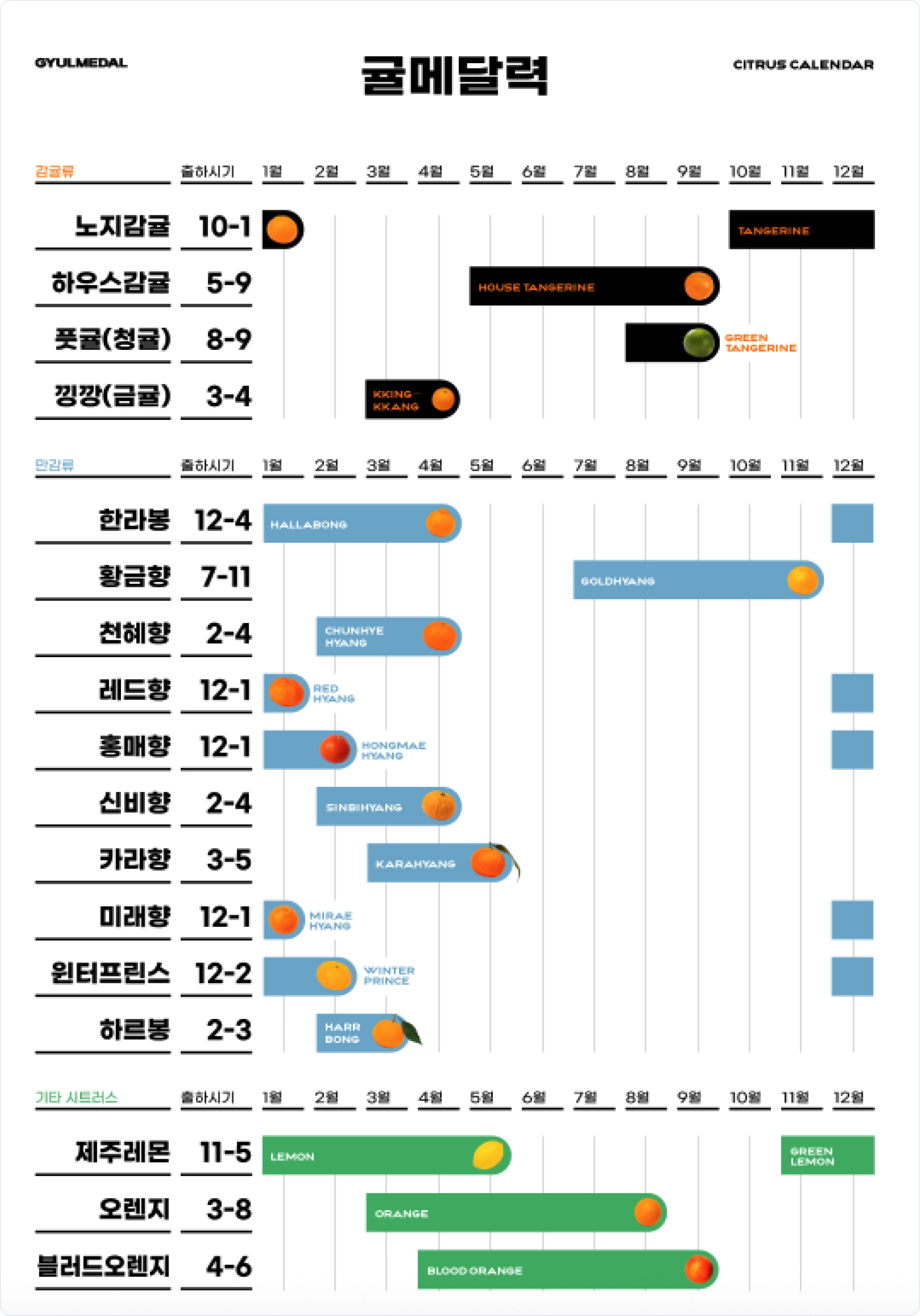 귤메달은 시트러스 전문 브랜드로, 그냥 '귤'이 아닌 다양한 시트러스를 취향별로, 계절별로 즐기는 방법을 소개합니다. 특히 ‘귤메달력’이라는 제철 캘린더 콘텐츠로 고객의 탐색 경험을 확장시키는 점이 재미있어요.