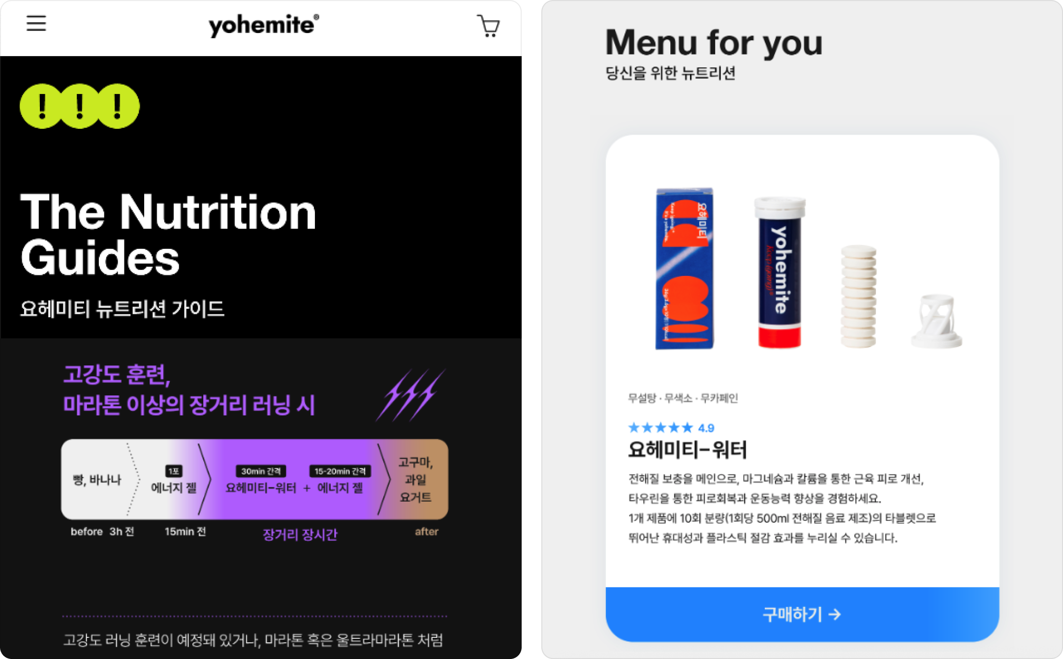 요헤미티는 러너·사이클리스트를 위한 뉴트리션 가이드와 마라톤 패키지/100% 페이백 챌린지를 함께 운영해, 제품 구매를 루틴 실천 경험으로 자연스럽게 연결합니다.