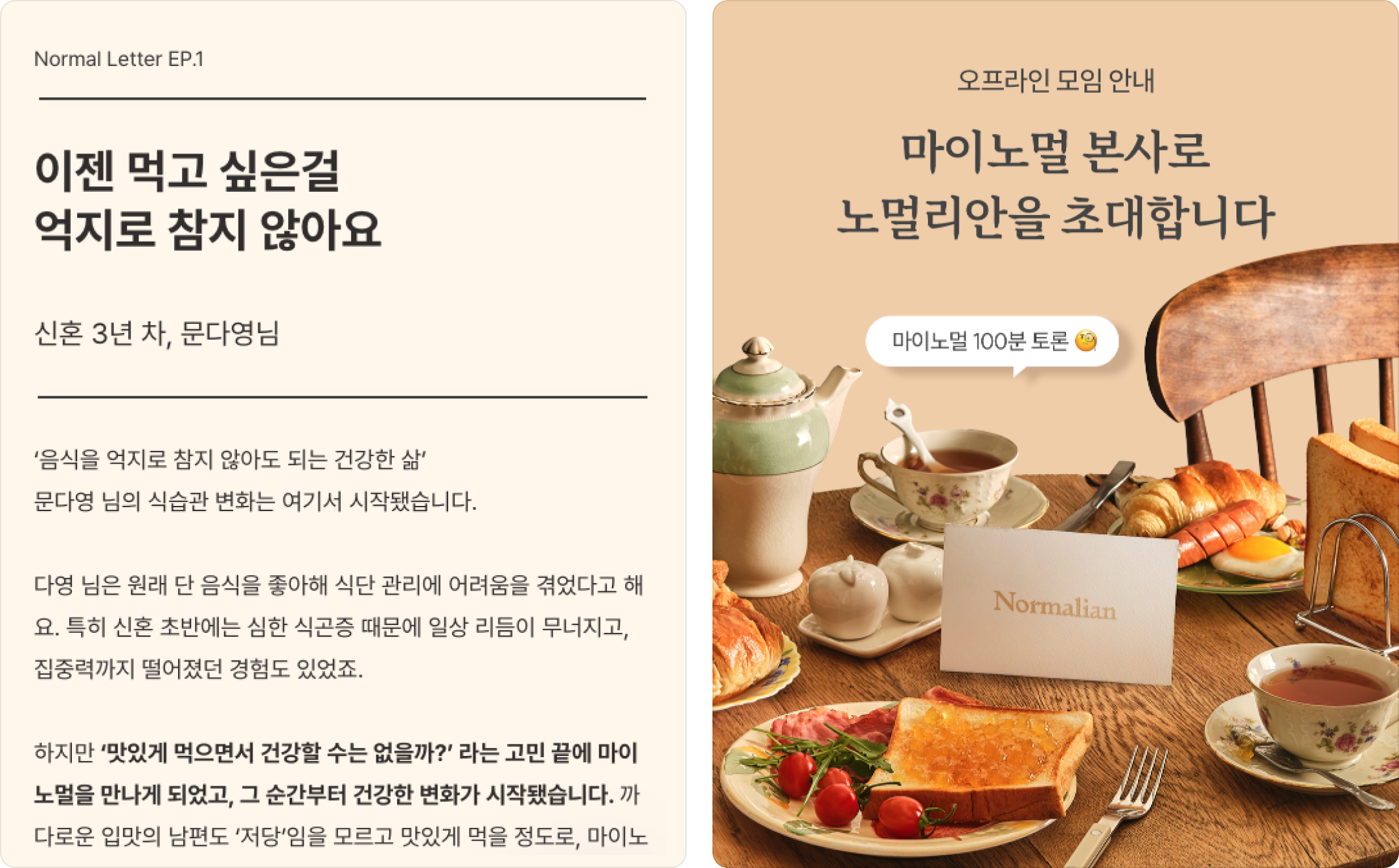 마이노멀은 자사몰을 단순 판매 채널이 아닌 관계가 쌓이는 브랜드 공간으로 운영하는 사례예요. 멤버십 등급 혜택, 고객 인터뷰 콘텐츠, 오프라인 모임 등 자사몰 안에서 팬덤과 충성도를 자연스럽게 확장하고 있습니다.