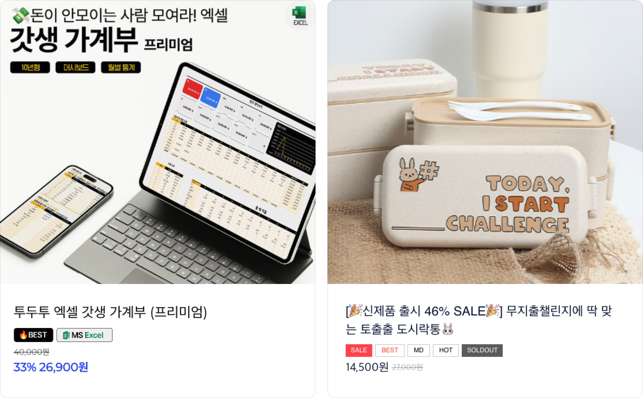 - 상품 썸네일에 ‘절약템’, ‘루틴템’, ‘챌린지 추천’ 같은 뱃지를 적용해 고객의 구매 동기 자극