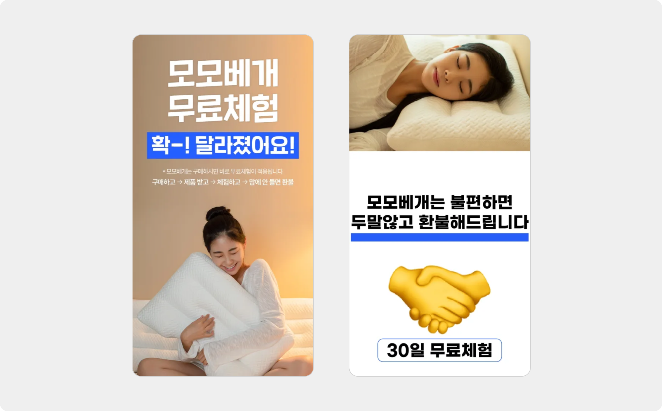 1. 반품을 두려워하기보다 ‘경험 기회’로 전환하세요. 망설이다 이탈하는 고객을 붙잡는 비용이 반품 처리보다 훨씬 큽니다. 매트리스·가구 같은 고관여 제품군이라면 30일 무료 체험 후 환불, 사용 후 불만족 시 전액 환불 같은 정책이 구매 결정에 큰 힘을 줘요. 뷰티 카테고리라면 본품 구매 시 샘플을 동봉하고, 패션 카테고리라면 사이즈 실패 보장 정책을 운영해 경험 진입 장벽을 확 낮춰보세요.