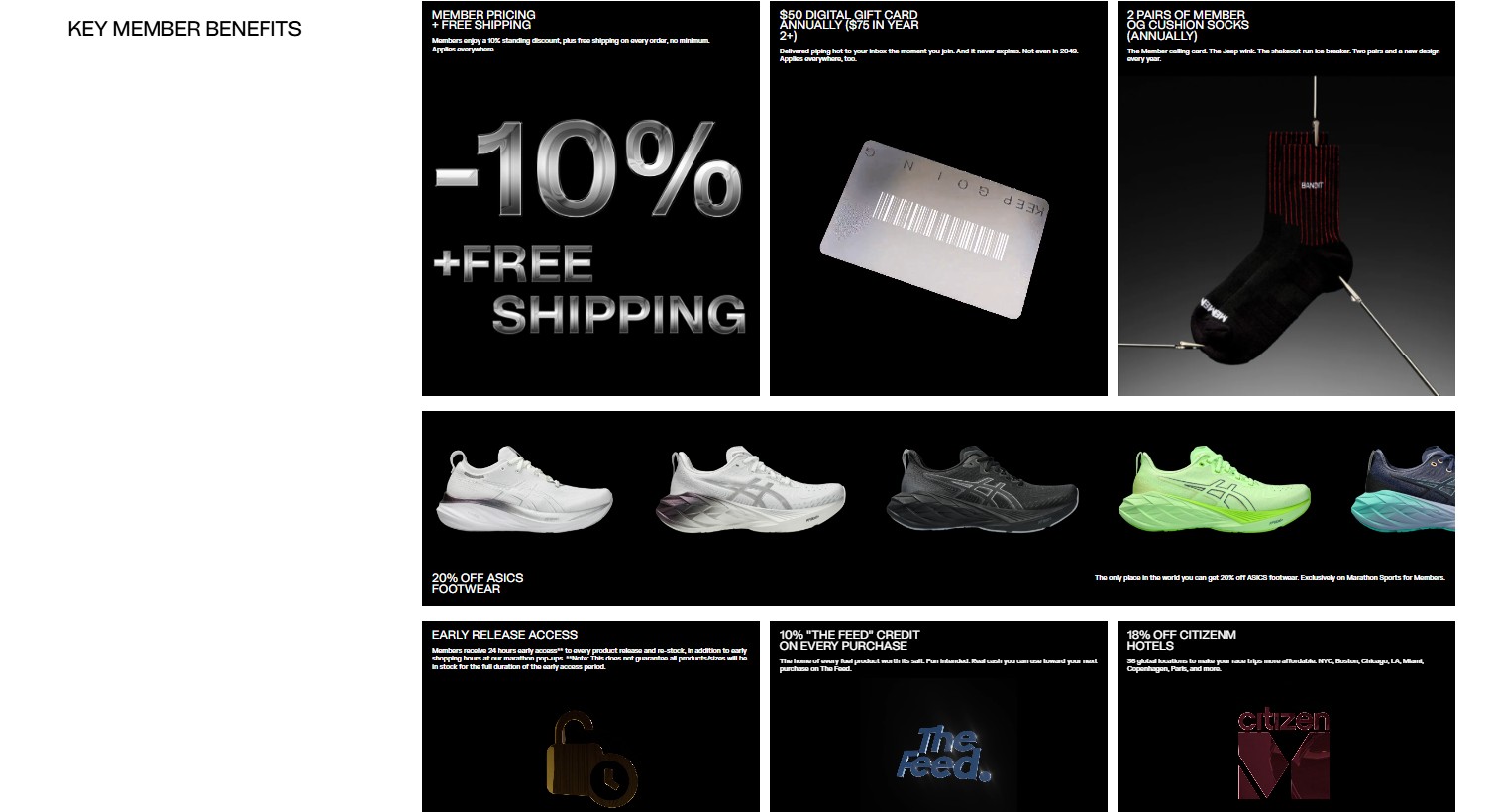 이외에도 사우나 할인, 회복을 위한 요가 및 수면 용품 할인 등 멤버십은 철저히 '러너'들에게 꼭 필요한 혜택으로 구성되어 있습니다. 그중에서도 신제품을 일반 고객보다 먼저 구매할 수 있는 혜택은 소량 제작 및 출시 방식과 시너지를 내면서 멤버십 가입에 대한 욕구를 더 자극시킵니다.