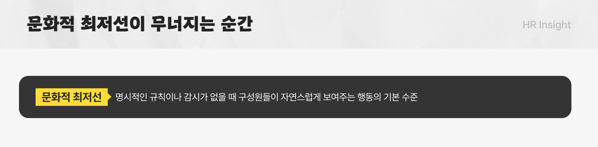 이것이 바로 조직의 '문화적 최저선(Cultural Baseline)'이 무너지는 순간이다. '문화적 최저선'이란, 명시적인 규칙이나 감시가 없을 때 구성원들이 자연스럽게 보여주는 행동의 기본 수준을 의미한다. 문제가 발생했을 때, 우리가 기댈 수 있는 가장 낮은 수준의 해결책이 '성숙한 논의'와 '자율적인 배려'가 아닌, '통제와 규칙'이 되어버린 것이다.