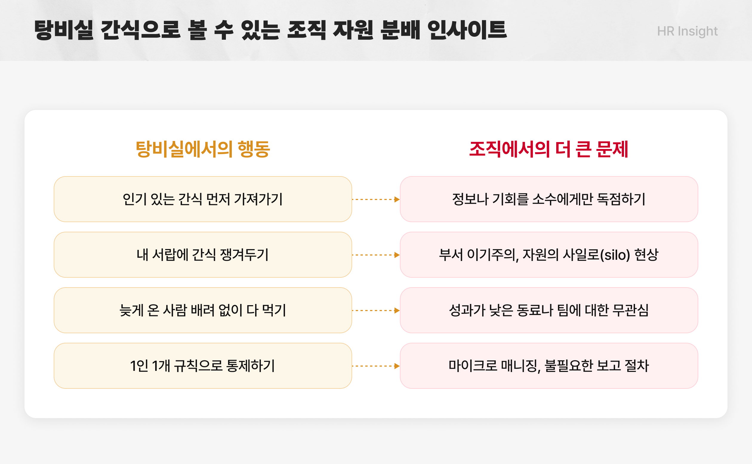 탕비실의 작은 습관은 우리 조직의 자원 분배 원칙을 비추는 거울이에요. 섣부른 규칙 늘리기보다는, 우리 다운 기준과 투명한 운영을 설계하는 것이 더 중요하다는 최지훈 작가님의 두 번째 조직문화 인사이트였습니다.