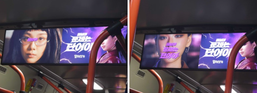 • 버스 내부 디지털 광고 – 차량 내 디지털 모니터를 활용해 출퇴근 시간대 버스 이용객에게 반복 노출을 유도했습니다. “바보야, 문제는 단어야” 문구와 함께 광고 영상을 함께 구성해 승객의 시선이 머무는 공간에서 브랜드 메시지를 직관적으로 전달했습니다.