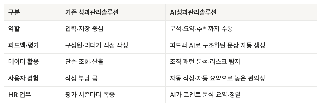과거의 성과관리솔루션이 ‘작성-제출-보관’ 중심의 시스템이었다면, AI성과관리솔루션은 ‘작성-분석-추천-요약-코칭’까지 수행하는 지능형 도구라는 점에서 본질적으로 다릅니다.