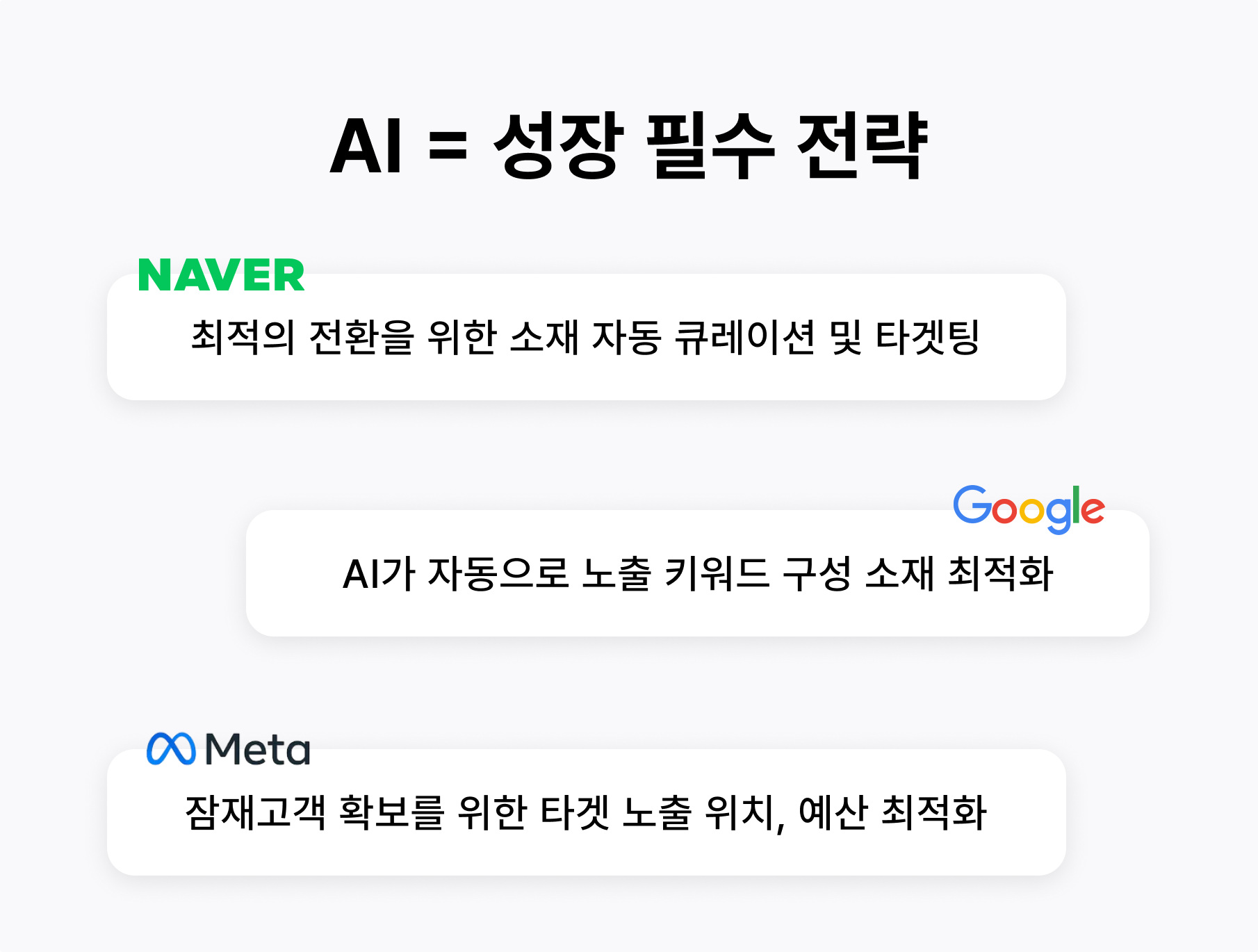구매 의도를 가지고 물건을 하나하나 탐색하는 방식이 아닌, 우연히 들어와 AI가 보여주고 발견해 구매하는 쇼핑을 해요. AI는 계속해서 발전하고 그에 맞춰 소비 방식도 격변하는 이때 우리 쇼핑몰 규모에 어떤 전략으로 어떤 마케팅을 펼쳐야 할지 고민이실 것 같아요.