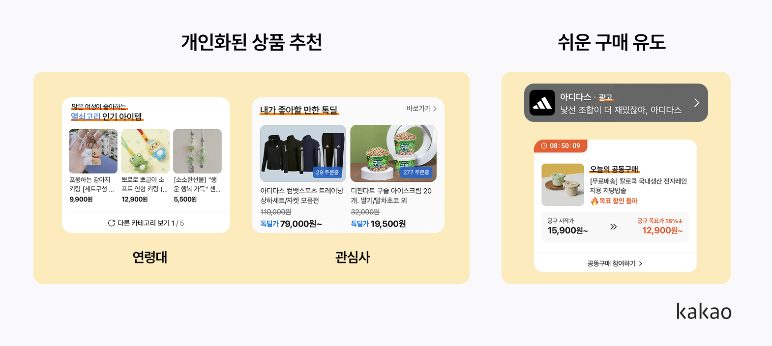 카카오는 특히 커머스에 진심인데요. 카카오톡 내에서 바로 참여할 수 있는 쇼핑라이브와 인플루언서 협업 광고, 카카오톡 추천 아이템 등 쇼핑탭에서 한번에 확인할 수 있도록 구성했어요. 이를 통해 소비와 커머스 경험을 자연스럽게 연결하고 있어요.
