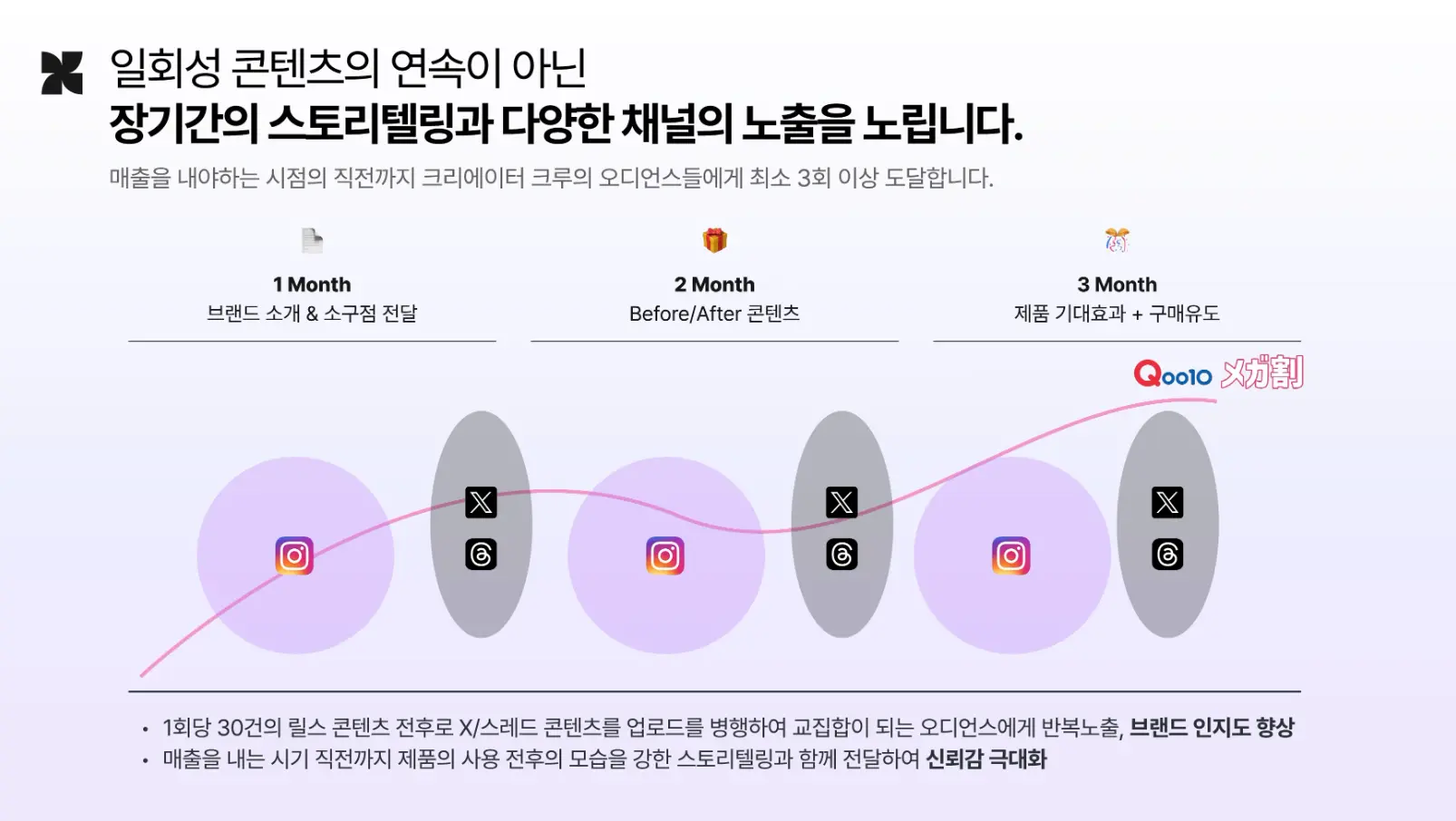 또한 일회성 콘텐츠에 그치지 않고, 장기간의 스토리텔링을 다양한 채널에서 노출하여 프로모션 시즌 직전까지 크리에이터 크루의 오디언스에게 최소 3회 이상 도달합니다.