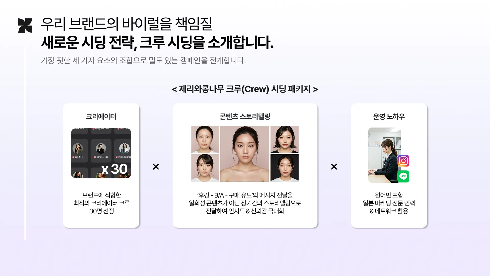 이러한 맥락에서 저희는 그래서 저희는 일본 전문 인력과 함께 하는 제리와 콩나무의 ‘크루 시딩 패키지’를 제안드리려고 합니다.