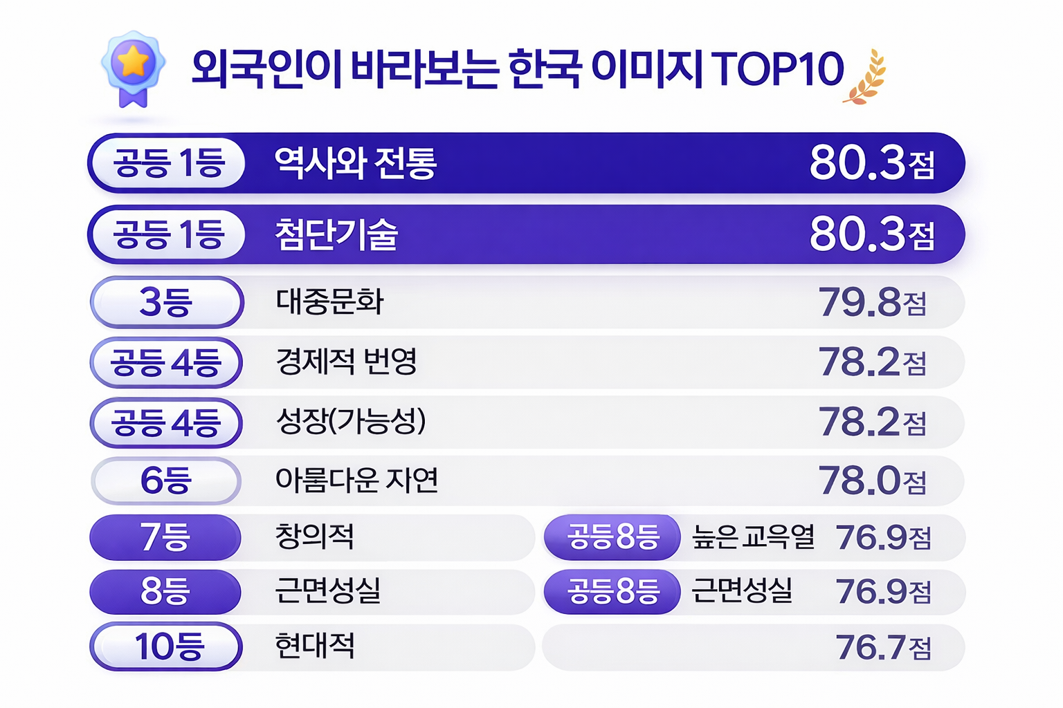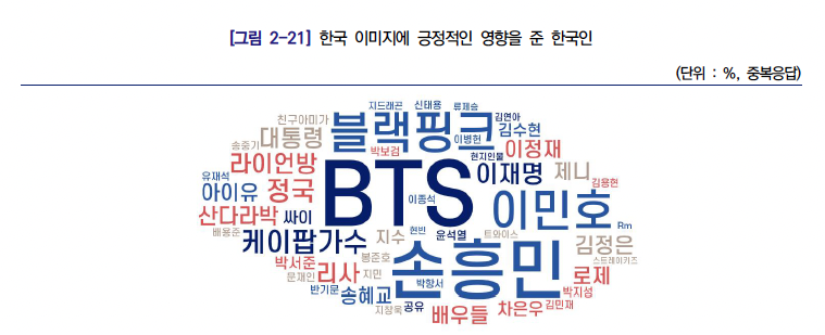 한국 이미지에 긍정적인 영향을 준 인물로는 BTS가 가장 많이 언급됐고, 손흥민, 블랙핑크, 이민호 등도 상위에 올랐어요. 음악, 스포츠, 드라마 등 여러 분야의 인물이 동시에 등장하고 있다는 점이 특징이에요. 이건 한 명의 스타 때문이 아니라 한국을 떠올리면 사람이 먼저 떠오르는 구조가 만들어졌다는 의미예요. 국가가 아니라 얼굴과 스토리로 인식되기 시작한 거죠.
