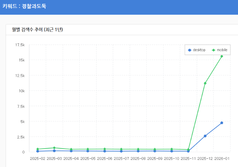 경찰과 도둑에 대한 대중들의 관심은 수치로도 확인할 수 있다. ‘경찰과 도둑’이라는 키워드의 네이버 검색량을 분석해보면 최근 3개월간 급격하게 상승하는 것을 볼 수 있다.