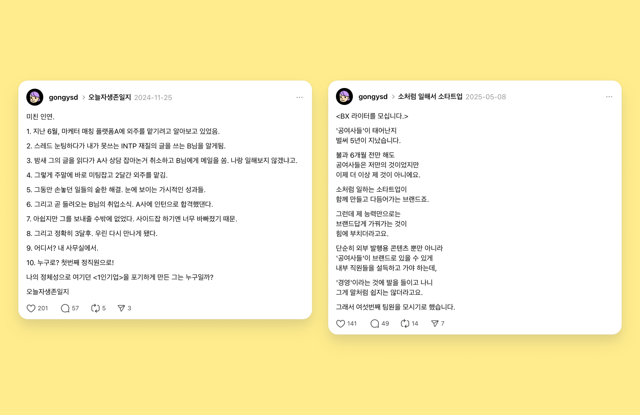 이슬기 대표가 스레드에 올린 구인 게시글 ⓒ 아임웹