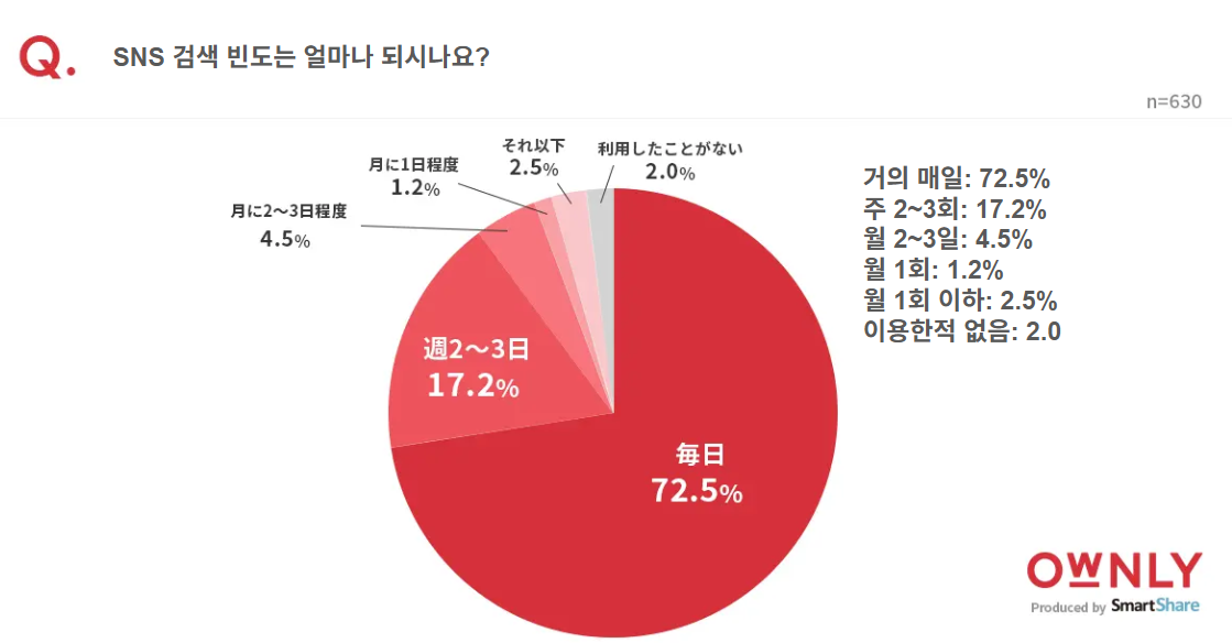 일본에서 SNS 검색은 이미 일상으로 자리 잡았습니다. 조사에 따르면, 무려 72.5%의 유저가 '매일' SNS 를 통해 정보를 검색하고 있습니다. 특히 상품이나 서비스를 구매할 때 중요하게 참고하는 정보 중 하나가 바로 'SNS상의 후기'인데, 그 영향력은 47.1%에 달합니다. 즉 유저들이 직접 발신하는 정보인 UGC가 실제 구매 전환에 결정적인 영향을 미치고 있는 셈입니다.