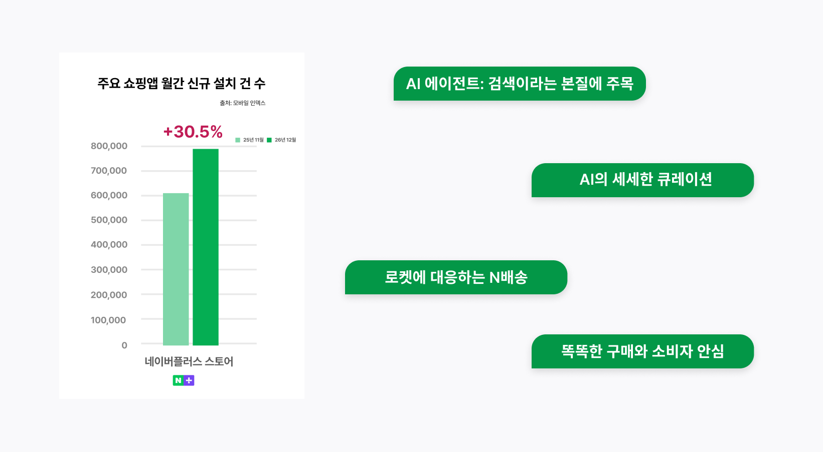 AI 에이전트를 통한 똑똑한 구매와 N-배송의 소비자 안심으로 쿠팡을 넘보는 강력한 대안으로 네이버가 급부상하고 있습니다.