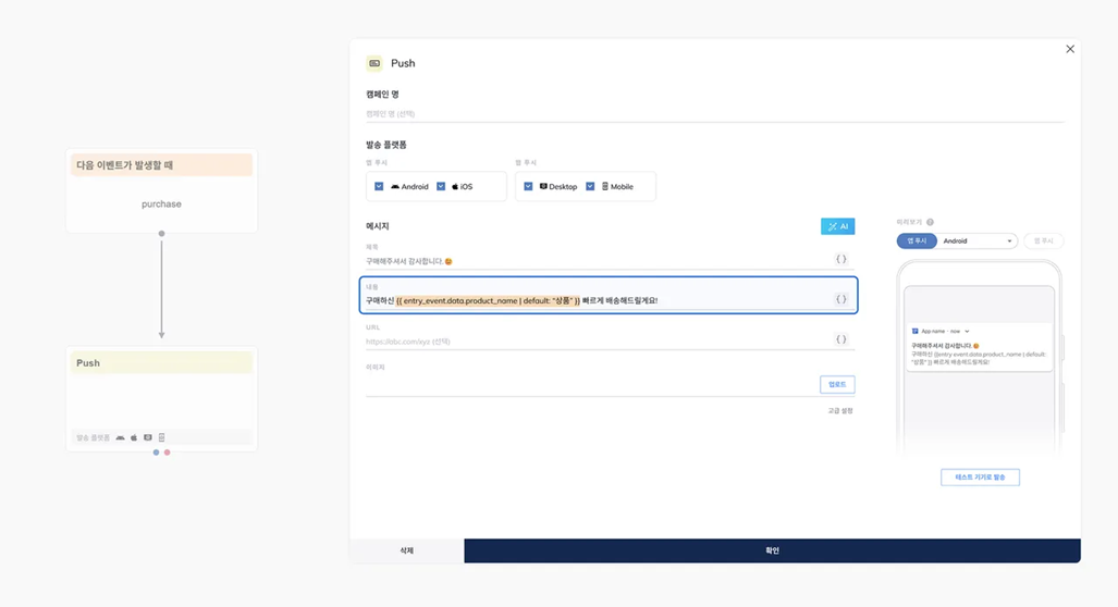 또한 개발 리소스에 대한 의존도도 크게 낮아집니다. 이벤트 조건을 설정하고, 세그먼트를 구성하고, 메시지를 연결하는 과정이 하나의 흐름 안에서 이루어지면 마케터가 직접 캠페인을 설계하고 운영할 수 있습니다. 이는 실행 속도를 높이고 테스트 사이클을 빠르게 만듭니다.