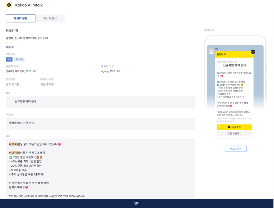 그 결과, 자동화 메시지가 적용된 구간에서 문의 전환율이 약 20% 이상 개선되었습니다. 일괄적인 공지가 아니라, 특정 행동을 기준으로 한 트리거 설계가 비즈니스 성과에 얼마나 직결되는지를 증명한 사례입니다.