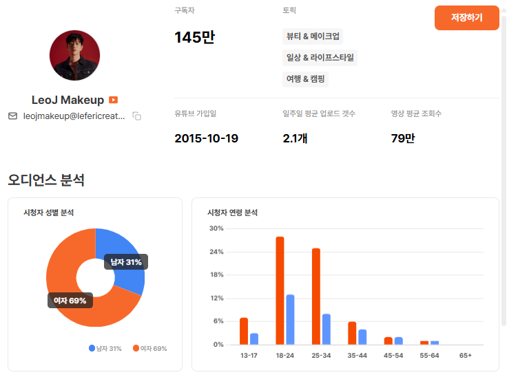 3위는 LeoJ Makeup입니다. 뷰티·메이크업 카테고리 기반 채널로 18–24세와 25–34세 여성 비중이 높게 형성되어 있습니다. Z세대 후반~20대 초중반 여성 타겟에 강한 구조를 가지고 있습니다.