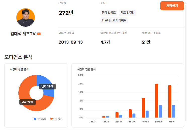 45–64세 구간 2위는 김대석 셰프TV입니다. 채널명처럼 요리 레시피를 소개하는 채널로, 55–64세, 65세 이상 비중이 특히 높고 여성 시청자가 70% 이상인 중장년 여성·주부층 타겟이 매우 선명한 채널입니다. 다른 채널 대비 타겟이 뚜렷하게 모여 있다는 점이 가장 큰 특징입니다.