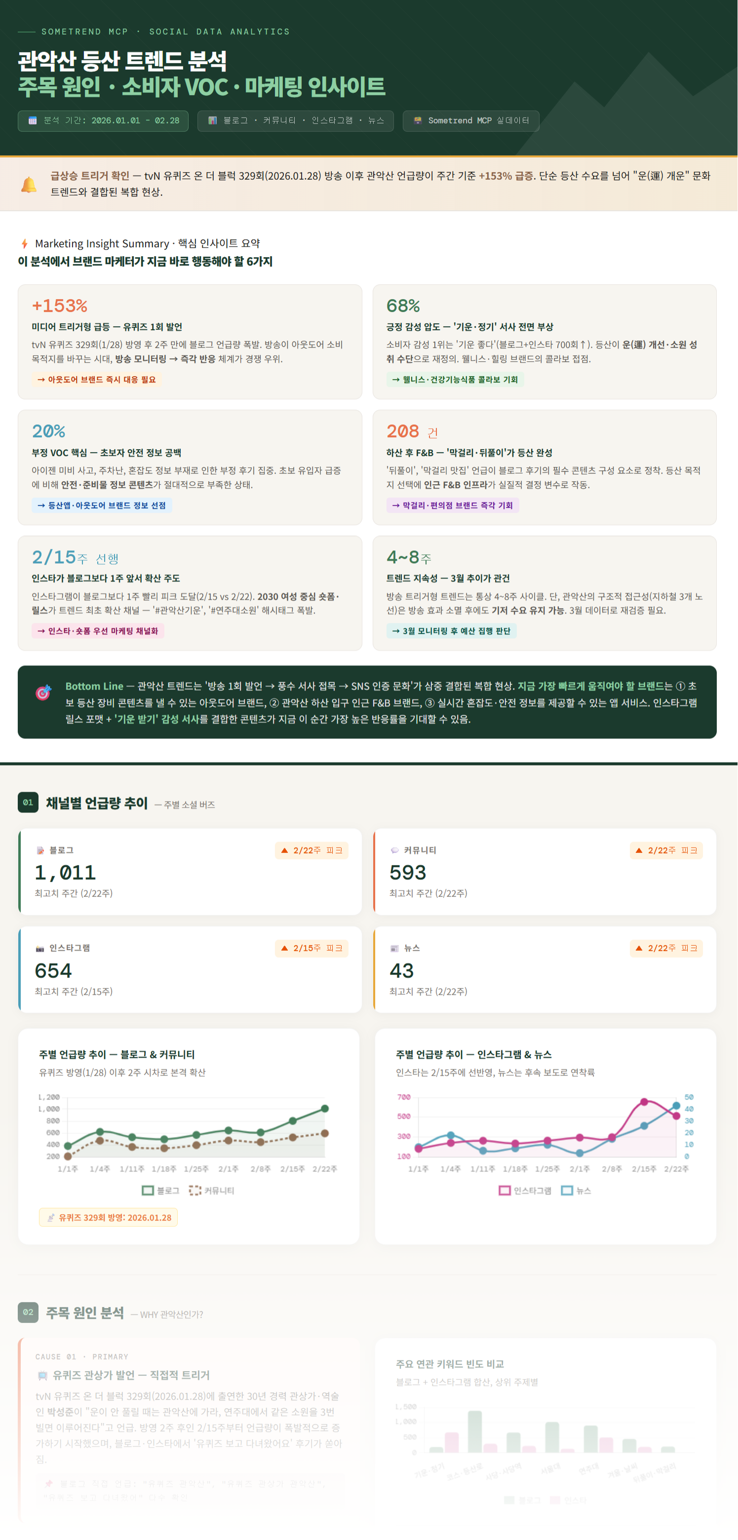 ✅ 주목 포인트 1 유퀴즈 방영 후 2주 만에 블로그 언급량 153% 급증, 인스타그램은 1주 앞서 피크를 기록하며 숏폼 바이럴이 트렌드를 선도했습니다.