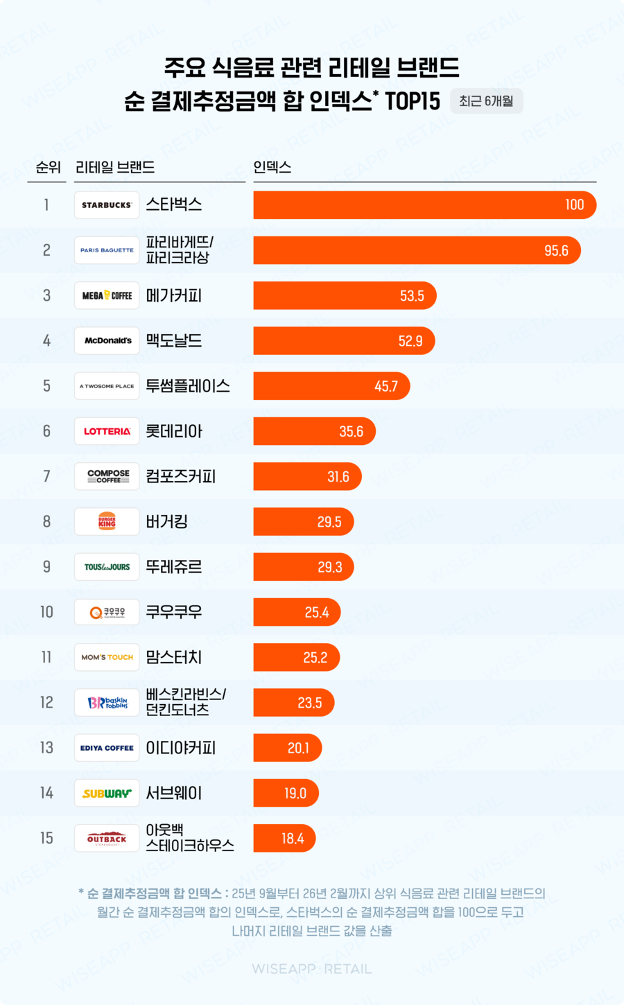 1위인 스타벅스의 결제금액을 100으로 두었을 때, 파리바게뜨/파리크라상(95.6), 메가커피(53.5), 맥도날드(52.9), 투썸플레이스(45.7), 롯데리아(35.6), 컴포즈커피(31.6), 버거킹(29.5), 뚜레쥬르(29.3), 쿠우쿠우(25.4), 맘스터치(25.2), 배스킨라빈스/던킨도너츠(23.5), 이디야커피(20.1), 서브웨이(19.0), 아웃백스테이크하우스(18.4) 순으로 뒤를 이었어요.