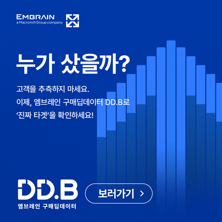 [1] 엠브레인 구매딥데이터: FMCG 및 외식 소비지표를 추정하기 위해 설계된 2만 명의 개인 소비 데이터. 영수증 구매 데이터(DD.B)를 통해 다각도로 시장 및 소비 패턴을 분석할 수 있는 빅데이터로 타사 조사와 수치 차이가 있을 수 있음.