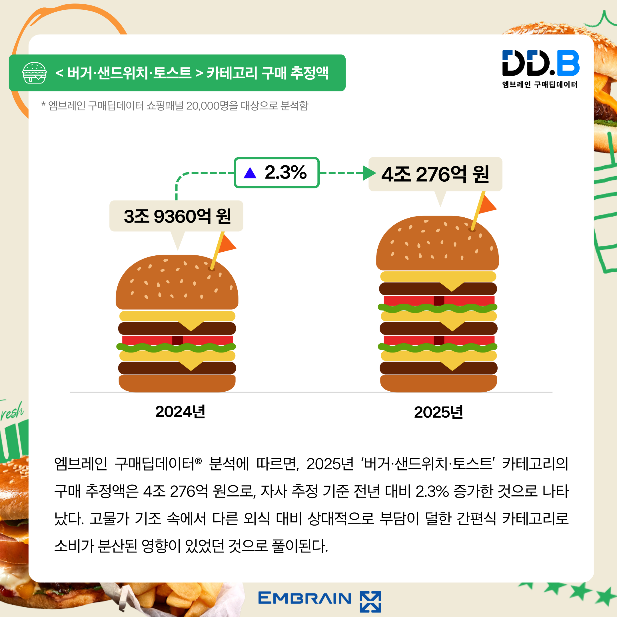 엠브레인 구매딥데이터[1] 분석에 따르면, 2025년 ‘버거·샌드위치·토스트’ 카테고리의 구매 추정액[2]은 4조 276억 원으로, 자사 추정 기준 전년 대비 2.3% 증가한 것으로 나타났습니다. 고물가 기조 속에서 다른 외식 대비 상대적으로 부담이 덜한 간편식 카테고리로 소비가 분산된 영향이 있었던 것으로 풀이됩니다.