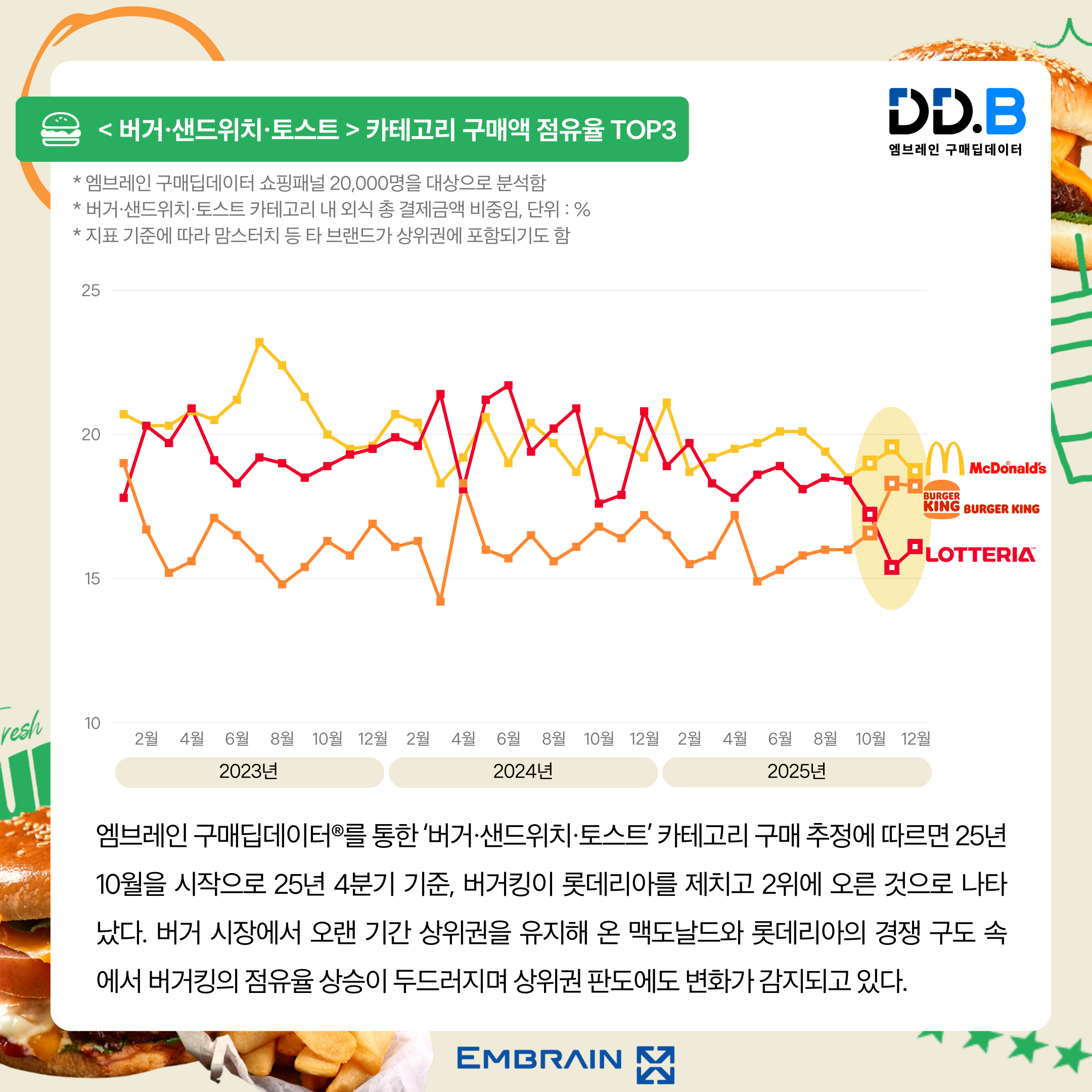 이 가운데 엠브레인 딥데이터®를 통한 ‘버거·샌드위치·토스트’ 카테고리 구매 추정에 따르면 2025년 10월을 시작으로 25년 4분기 기준, 버거킹이 롯데리아를 제치고 2위에 오른 것으로 나타났습니다. 버거 시장에서 오랜 기간 상위권을 유지해 온 맥도날드와 롯데리아의 경쟁 구도 속에서 버거킹의 점유율 상승이 두드러지며 상위권 판도에도 변화가 감지되고 있습니다.