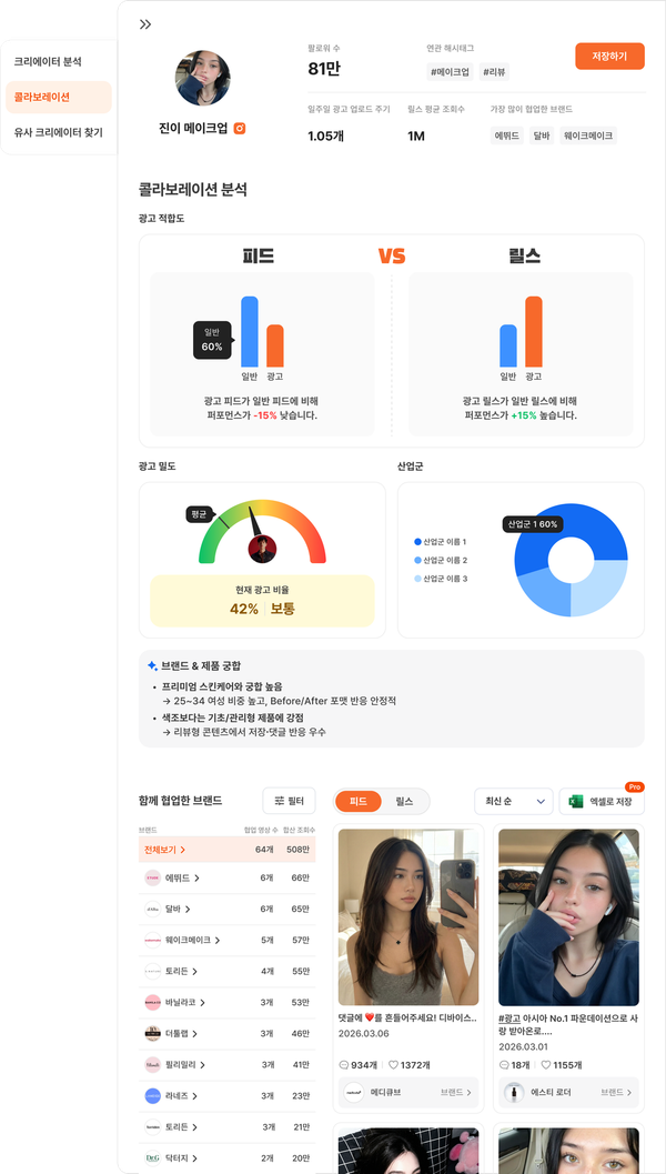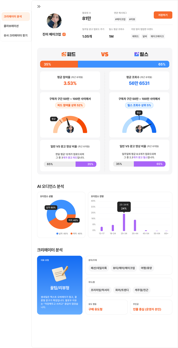 피드와 릴스 비중, 포맷별 참여율, 광고 콘텐츠 비율을 통해 이 크리에이터가 어떤 콘텐츠에서 강점을 가지는지를 한눈에 파악할 수 있고 AI 분석을 통해 콘텐츠 유형, 주제, 무드, 유도 행동까지 정리되어 이 크리에이터가 어떤 방식으로 반응을 만드는 사람인지까지 확인할 수 있습니다.
