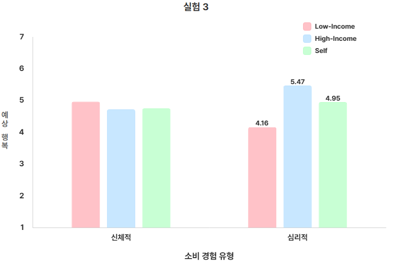 [소득 수준과 욕구 유형에 따른 욕구 중요성 평가 차이] 2. 소득 수준에 따른 동일 욕구에 대한 행복감 차이를 확인하다. 연구 결과, 참가자들은 저소득 소비자가 심리적 소비 경험으로부터 고소득 소비자보다 더 적은 행복을 얻을 것이라고 기대하는 경향을 보였습니다. 또한 자신 자신을 기준으로 비교했을 때에도, 저소득 소비자는 자신보다 더 낮은 수준의 행복을 경험할 것으로 예상된 반면, 고소득 소비자는 자신 보다 더 큰 행복을 경험할 것이라고 판단하는 것으로 나타났습니다. 반면, 하위 욕구를 충족하는 신체적 소비 경험에서는 소득 수준에 따라 예상되는 행복의 크기가 유의미한 차이가 나타나지 않았습니다.