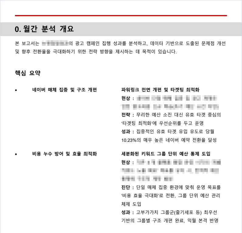 기존의 다매체 운영 환경에서 네이버 단일 매체 집중 구조로 전환했고, 그에 맞춰 운영 목표를 노출 확보가 아니라 비용 효율 극대화로 재설정했습니다.