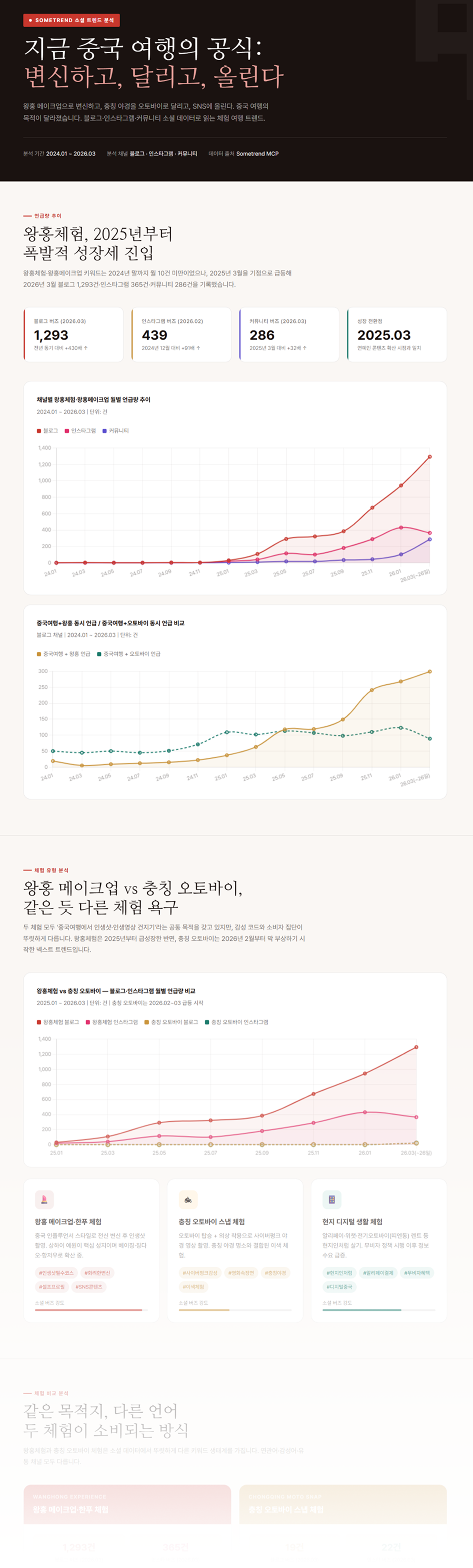 ✅ 주목 포인트 1 왕홍체험 언급량 2026년 3월 1,293건으로 2년 전 대비 430배 급증했습니다. 충칭 오토바이 스냅도 릴스 150만 뷰와 함께 빠르게 부상 중입니다.