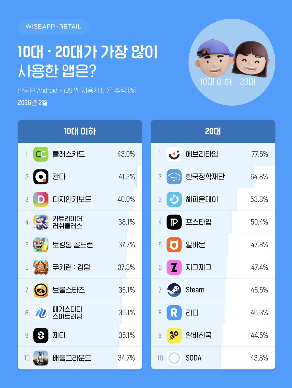 에브리타임(77.5%), 한국장학재단(64.8%), 해피문데이(53.8%), 포스타입(50.4%), 알바몬(47.8%), 지그재그(47.4%), Steam(46.5%), 리디(46.3%), 알바천국(44.5%), SODA(43.8%).