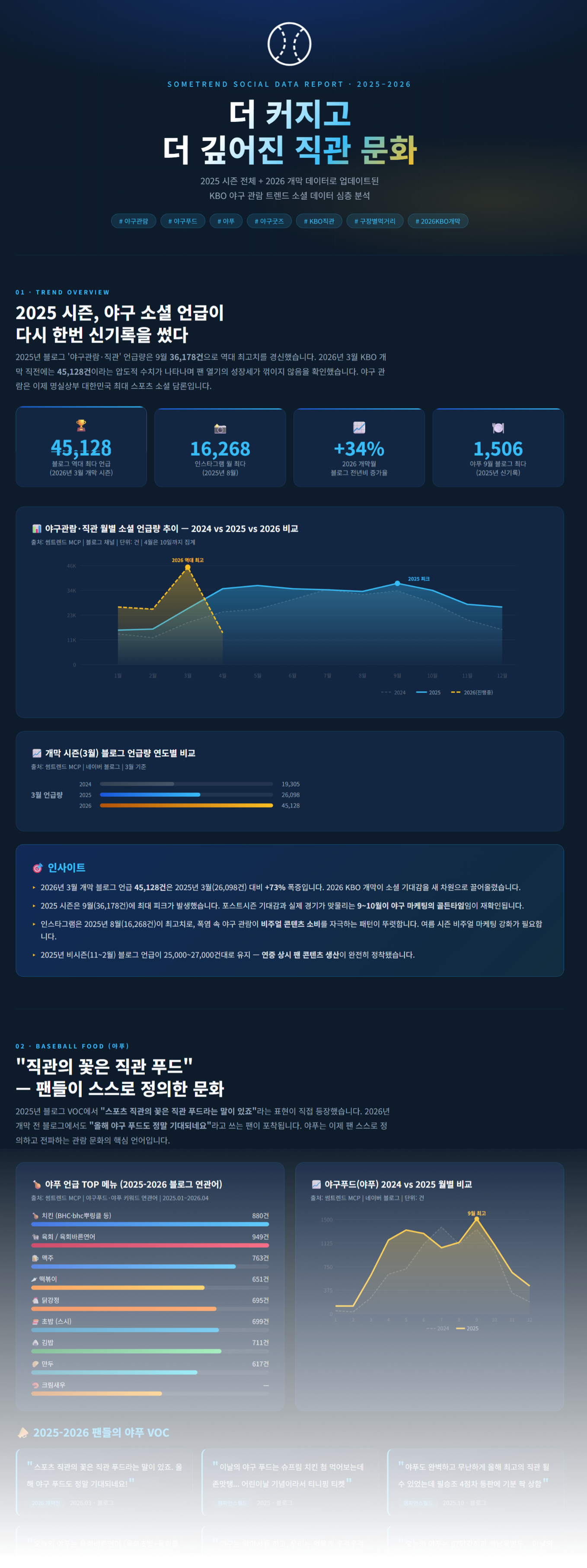 ✅ 주목 포인트 1 2026년 KBO 개막 시즌 블로그 언급량 역대 최고치 기록, 전년 동월 대비 +73% 폭증하며 구장별 독자적인 야푸 문화가 정착됐습니다.