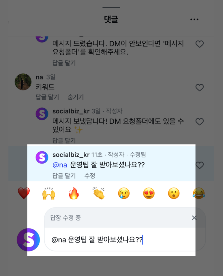 수정된 댓글에는 '수정됨' 표시만 남고 이전 내용은 공개되지 않기 때문에 부담도 없어요. 이러한 변화는 특히 브랜드 계정에서 편리해졌는데요. 고객 응대 과정에서의 실수를 빠르게 보완하거나 보다 적절한 표현으로 수정할 수 있어서 커뮤니케이션이 개선될 수 있게 되었어요.