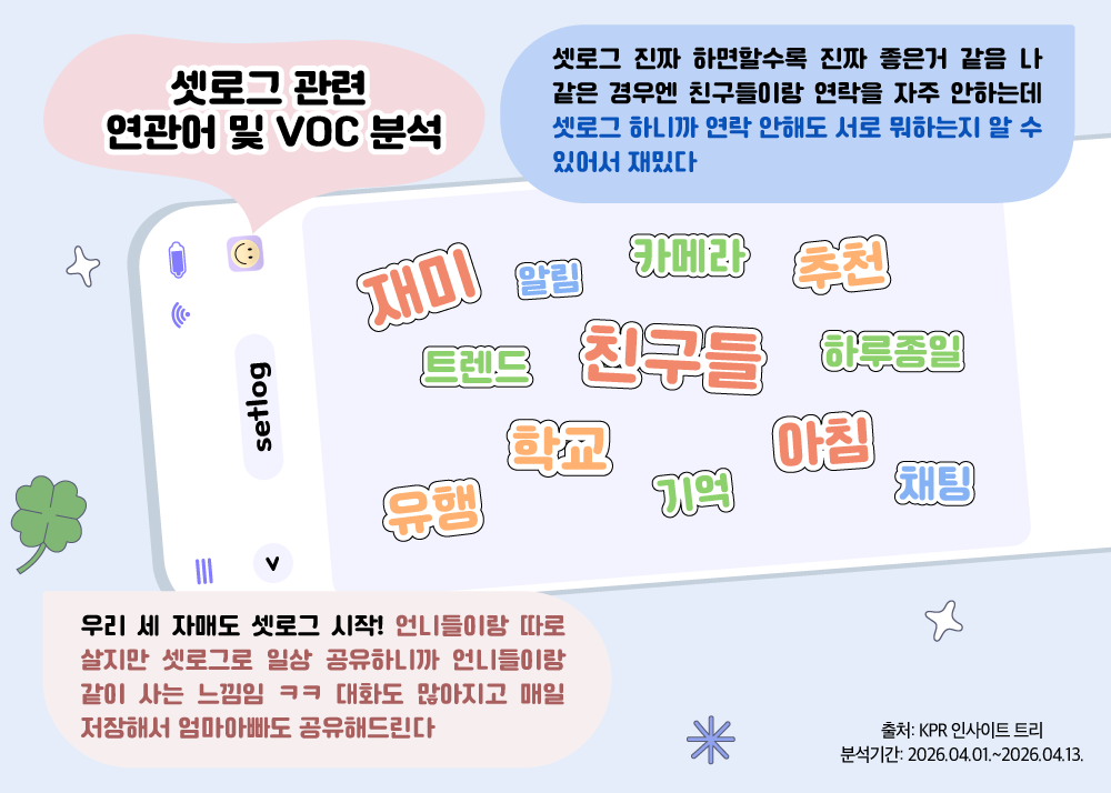 빅데이터 분석 결과, 셋로그 사용자들은 ‘친구들’, ‘아침’, ‘재미’ 를 핵심 키워드로 꼽으며 단순한 앱 사용을 넘어 지인들과의 정서적 연결에 높은 가치를 두는 것으로 나타났습니다. 특히 실제 사용자들은 억지로 연락하지 않아도 서로의 일상을 실시간으로 파악할 수 있는 점에 만족을 느끼며, 따로 살더라도 ‘함께 사는 듯한 동질감’을 얻는다는 점을 가장 큰 매력으로 꼽고 있습니다. 아울러 ‘알림’을 통해 하루 종일 학교나 집에서의 평범한 순간을 기록하고 공유하는 행위가 1020 세대 사이에서 하나의 놀이이자 힙한 유행’으로 자리 잡았음을 확인할 수 있습니다. |