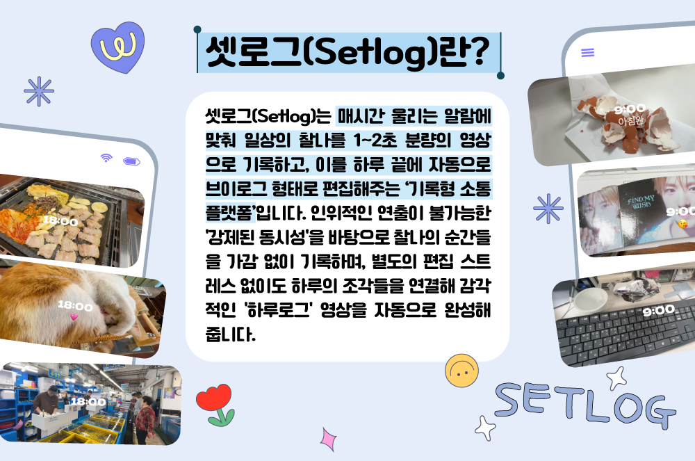 셋로그는 화려하게 연출된 모습보다는 버스를 기다리거나 멍하니 앉아 있는 등 소요되는 시간 속의 사소하고 ‘시답잖은’ 순간들을 있는 그대로 쌓아가는 기록 방식을 지향합니다. 특히 불특정 다수에게 노출되는 공개형 플랫폼과 달리, 소수 정예의 인원만 참여하는 폐쇄적인 구조를 통해 진짜 가까운 지인들과만 날것의 진솔한 일상을 나누는 ‘친친폼(친한 친구+플랫폼)’으로서의 독보적인 성격을 띠며 새로운 소통 문법을 제시하고 있습니다.