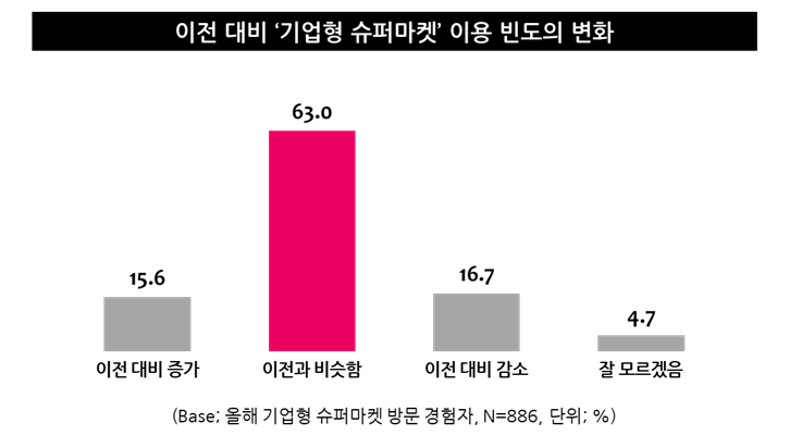 한편 최근 코로나19로 인해 오프라인 유통채널들이 전반적으로 큰 타격을 입고 있는 상황에서도 ‘기업형 슈퍼마켓(SSM)’만큼은 나름 선방을 하고 있다는 뉴스를 접할 수가 있는데, 이번 조사 결과에서도 이런 현상을 확인해볼 수 있었다. 소비자 10명 중 9명(88.6%)이 올해 대형 유통업체들이 운영하는 기업형 슈퍼마켓을 방문한 경험이 있었으며, 이용 빈도는 예전과 비슷한 수준(63%)에서 유지되고 있는 것으로 나타난 것이다. 이용 빈도가 예전보다 증가했다는 응답(15.6%)과 감소했다는 응답(16.7%)에는 큰 차이가 없었다.