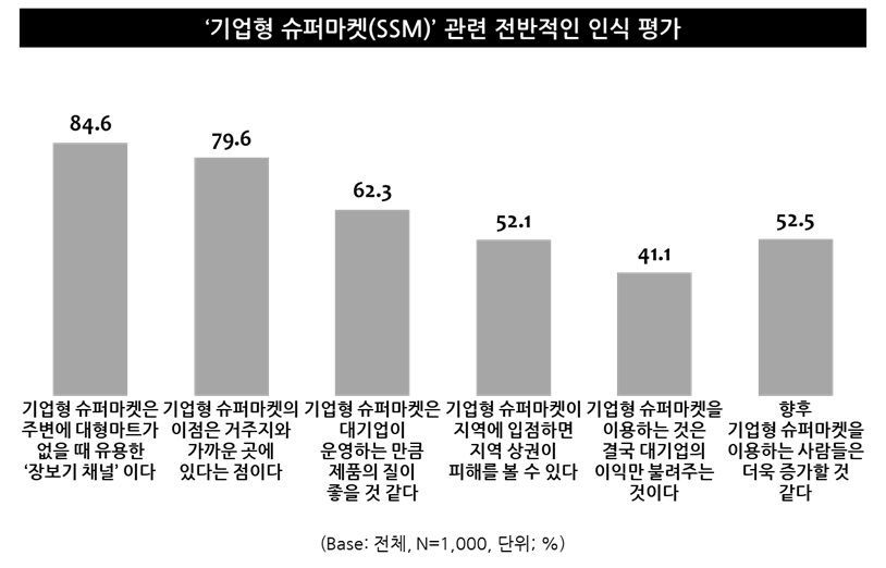 연령이 높을수록 기업형 슈퍼마켓이 지역상권에 피해를 주고(20대 47.2%, 30대 50.8%, 40대 52.4%, 50대 58%), 대기업만 배부르게 한다(20대 34.8%, 30대 39.2%, 40대 46.4%, 50대 44%)는 비판적 의견도 많이 드러내는 편이었다. 기업형 슈퍼마켓의 향후 시장 전망은 밝게 예상하는 것으로 나타났다. 전체 절반 이상이 기업형 슈퍼마켓 매장이 지금보다 더 많아질 것이고(56.4%), 기업형 슈퍼마켓을 이용하는 사람들도 더욱 증가할 것(52.5%)이라고 내다본 것이다. 실제 대부분의 소비자들이 향후 기업형 슈퍼마켓을 이용할 의사를 피력하기도 했다.
