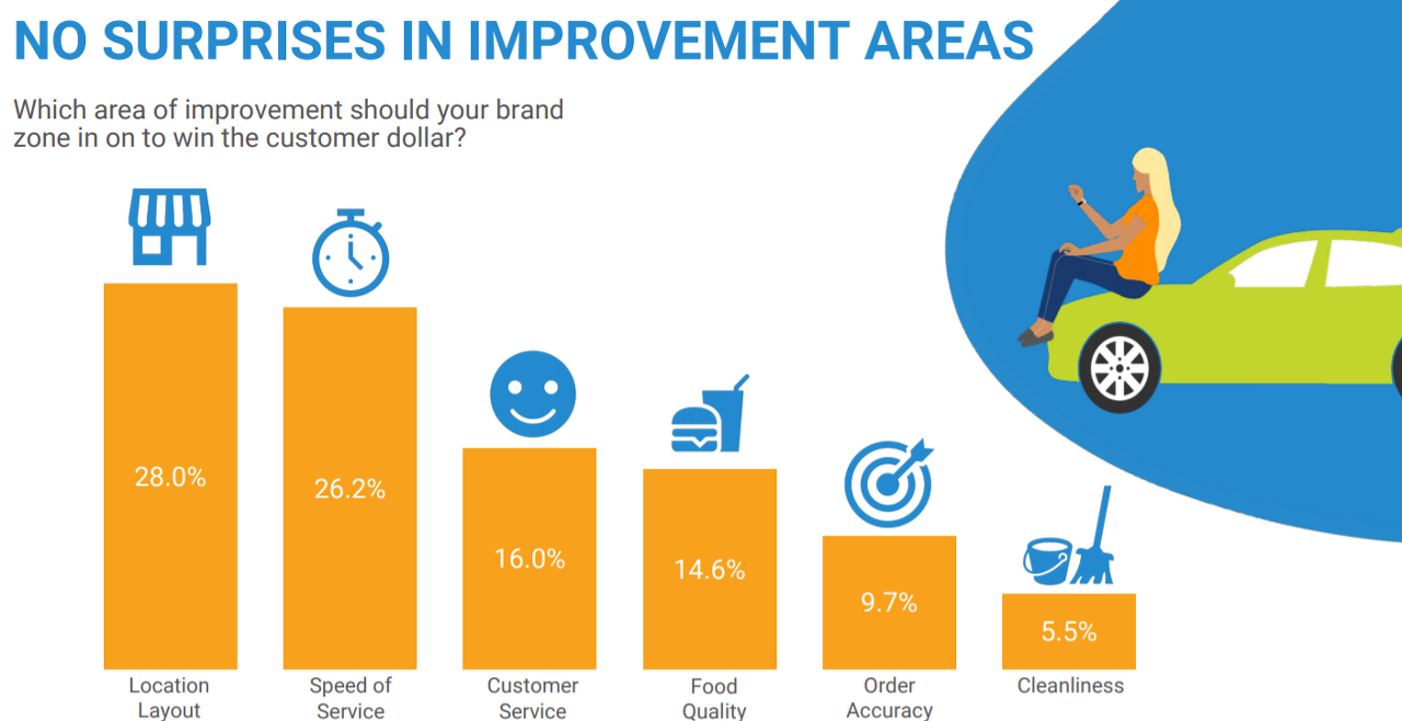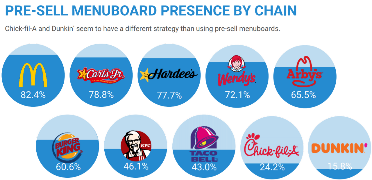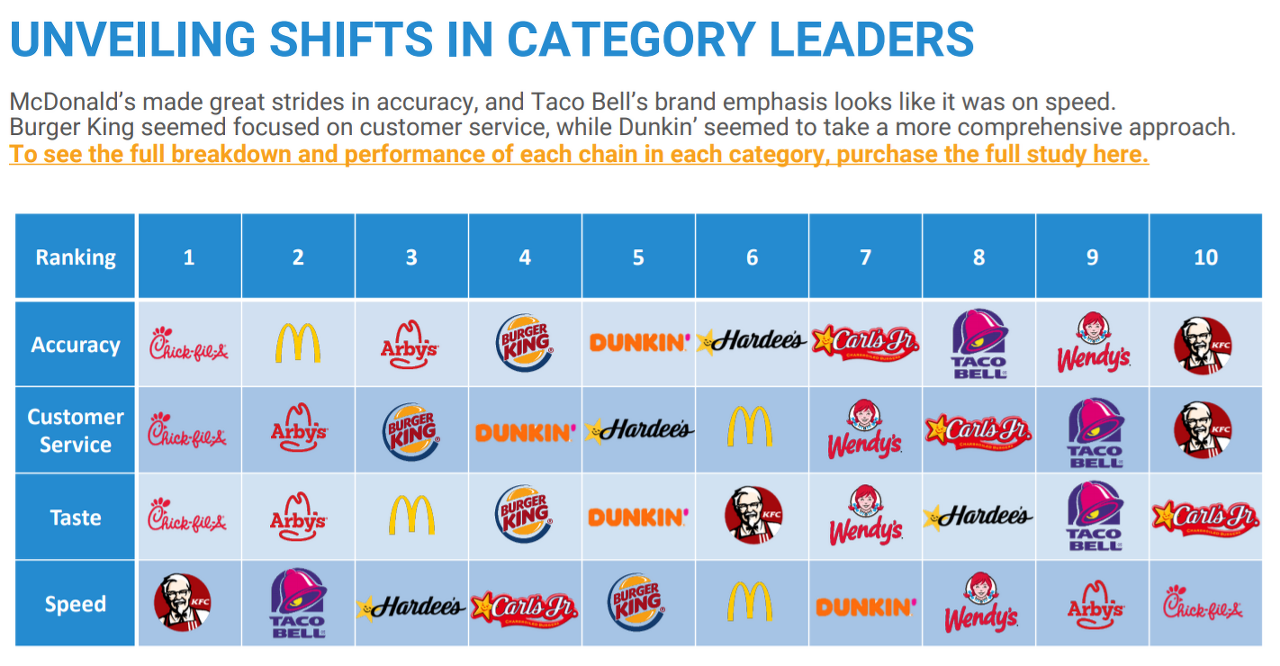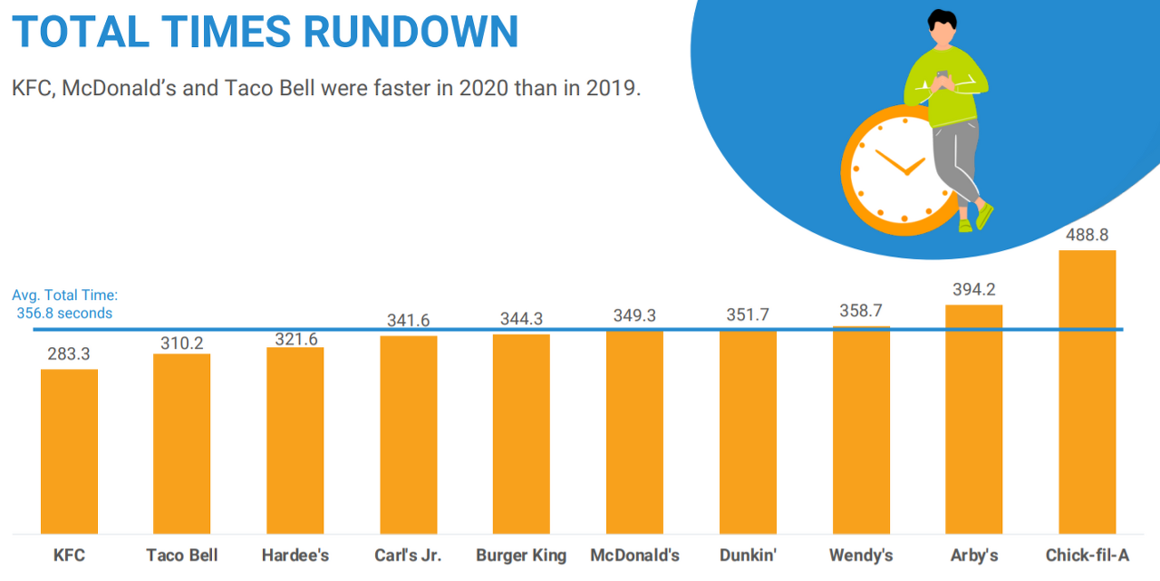 드라이브 스루 대기 시간이 가장 짧은 곳은 던킨도넛(Dunkin')으로 3분 27초로 1위를 차지했다. 그 뒤를 이어 웬디스(Wendy's)가 3분 51초, 버거킹(Burger King)이 3분 56초, 타코벨(TacoBell)과 KFC는 4분에서 4분 6초 사이를 기록했고, 아비스(Arby's)가 4분 39초, 하디스(Hardee's)가 4분 43초였다.