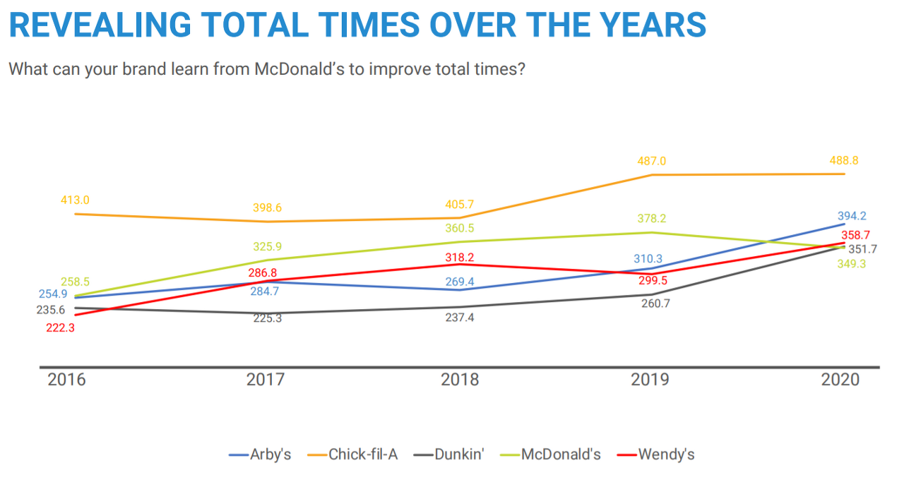 드라이브 스루의 대기시간은 예년에 비해 늘어나는 추세이다. 하기 그림과 같이 대부분의 패스트푸드 업체의 대기시간은 작년 대비 증가했다. 그도 그럴 것이 매장 내 식사는 현실적으로 불가능하고, 고객들도 드라이스 스루를 선호하고 있기 때문이다. 드라이브 스루를 찾는 고객은 늘어났으나, 관련 인프라나 고객의 편의를 위한 솔루션은 그대로 이기 때문이다.