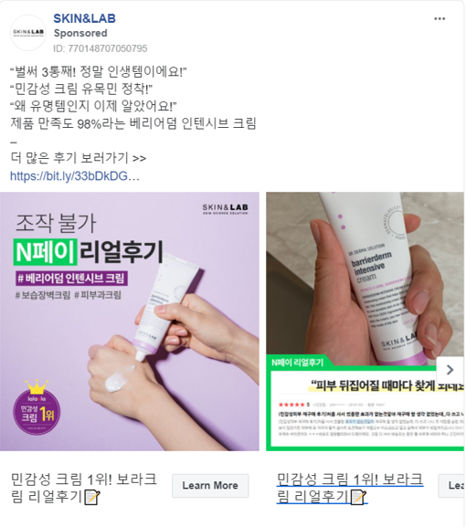 스킨앤랩 베리어덤 인텐시브 크림 – 리얼 VOC(Voice of Customer)를 노출하기 위해 Npay 후기를 활용하여 슬라이드로 소재 제작