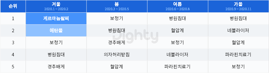 의료건강 용품·기기를 판매 또는 대여해주는 의료기상사 사이트 유입 키워드를 살펴보면, 올 초 겨울 에탄올의 유입량이 높은 순위를 차지한 것으로 나타났습니다. 이는 코로나19로 소독·위생에 관심이 많아지면서 손소독제의 성분인 에탄올에 대한 관심도 증가한 것으로 보입니다. 게르마늄팔찌가 건강팔찌로 유명해지면서 탐색이 증가한 것으로 나타났습니다. 하지만 게르마늄팔찌는 현재 식약처에 의료기기가 아닌 공산품으로 등록되어 있습니다. 그 이유로는 게르마늄팔찌에서 발생되는 음이온에 대한 효과를 입증하는 논문도 찾기 어렵기 때문이라고 하니 참고하시면 좋을 것 같습니다.