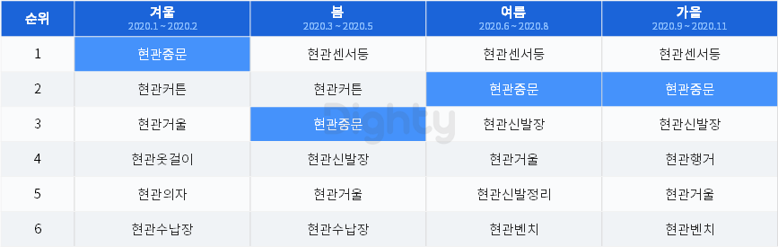놓이는 신발의 부피가 줄어드는 여름과 가을 '현관 인테리어'에 다른 계절보다 관심도가 높아지는 것을 볼 수 있습니다. '현관' 조합 키워드 분석 시 '현관중문'의 경우 추운 겨울철 가장 높은 유입수를 보였습니다. 현관을 통해 유입되는 차가운 공기를 막아주는 단열 역할로 겨울에 '현관중문'을 더 찾는 것으로 보입니다.