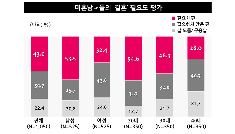 ● 미혼남녀 43% “결혼은 필요해” vs. 34.7% “결혼은 필요하지 않아”