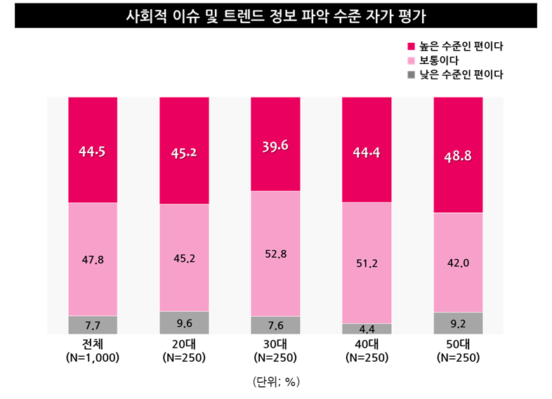 전체 44.5%만이 스스로 사회 이슈와 트렌드를 잘 파악하고 있다 느껴