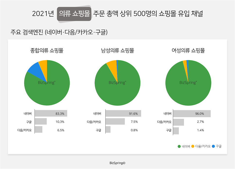 무엇보다 여성의류 쇼핑몰의 경우, 네이버가 96%를 차지할 정도로 압도적으로 높은 비율을 보였습니다.