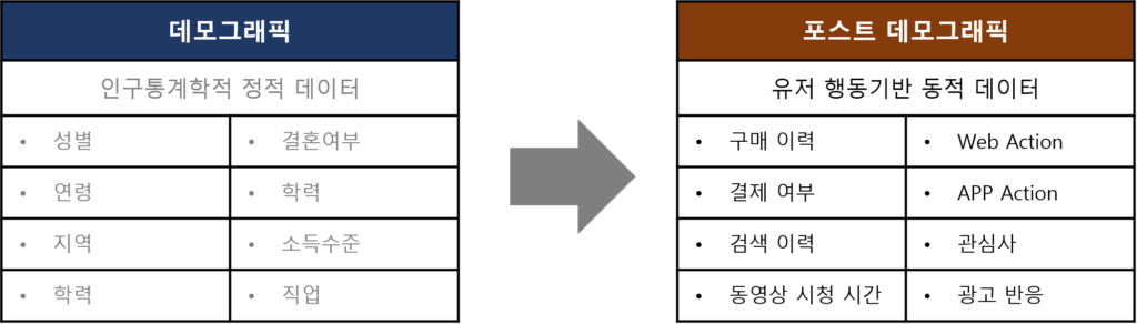 즉, 포스트 데모그래픽을 한마디로 말씀드리면 “유저 행동기반 동적 데이터“로 정의할 수 있을것입니다.