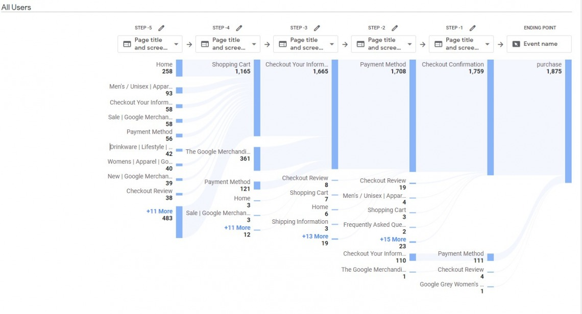 이제 퍼널 또는 경로 탐색에서 다양한 이벤트를 탐색할 수 있습니다. 기본적으로 GA4의 탐색 세그먼트에서 모든 종류의 테이블 보고서를 만들 수 있습니다. 구글 데모 계정에 대한 구매 경로 탐색의 예시를 알려드리겠습니다. 이제 이벤트 이전에 10단계까지 갈 수 있습니다.