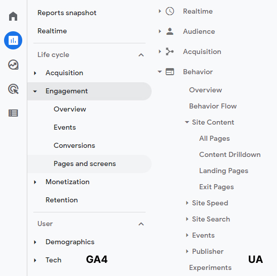 일단 GA 계정에 로그인하면 좌측에 아래와 같은 네비게이션 메뉴가 보일 것입니다. 아래는 GA4와 UA를 비교한 것입니다.